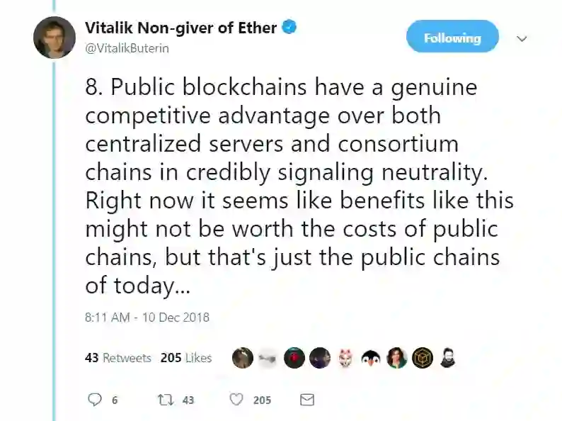 8. 相比于中心化服务器和联盟链,公有链有着一个真正的竞争优势,即它可靠地展现了自身所具有的中立性。当前类似这种的优势似乎不与公有链的成本成正比,但这是公有链的现状...
