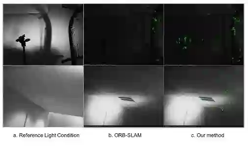 在不同光线条件下特征点追踪的结果。相较于在参考条件下(图a)和标准ORB-SLAM方案条件下(图b),我们的MLI方法(图c)匹配的特征点更多。