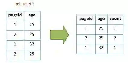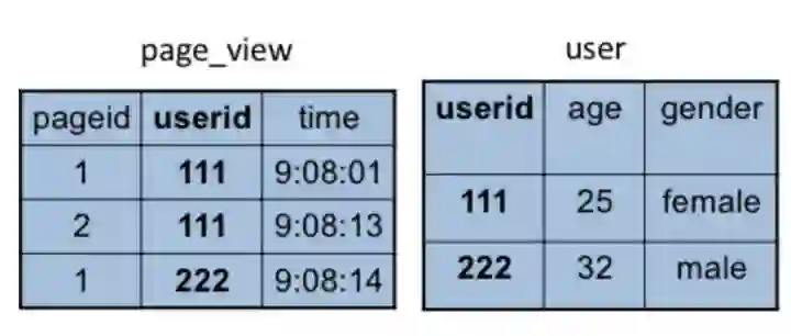 除了上面这些简单的聚合(group by)、过滤(where)操作,Hive还能执行连接(join on)操作。上面例子中,pv_users表的数据在实际中是无法直接得到的,因为pageid数据来自用户访问日志,每个用户进行一次页面浏览,就会生成一条访问记录,保存在page_view表中。而年龄age信息则记录在用户表user中。如下图: