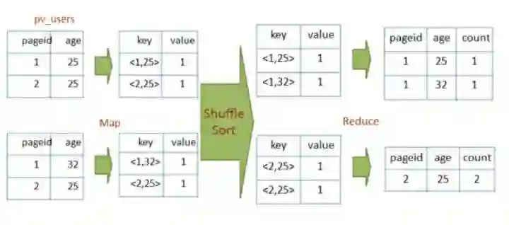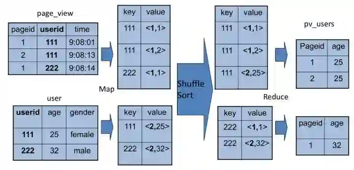 join的MapReduce计算过程和前面的group by稍有不同,因为join涉及两张表,来自两个文件(夹),所以需要在map输出的时候进行标记,比如来自第一张表的输出value就记录为<1, X>,这里的1表示数据来自第一张表。这样经过shuffle以后,相同的key被输入到同一个reduce函数,就可以根据表的标记对value数据求笛卡尔积,输出就join的结果。