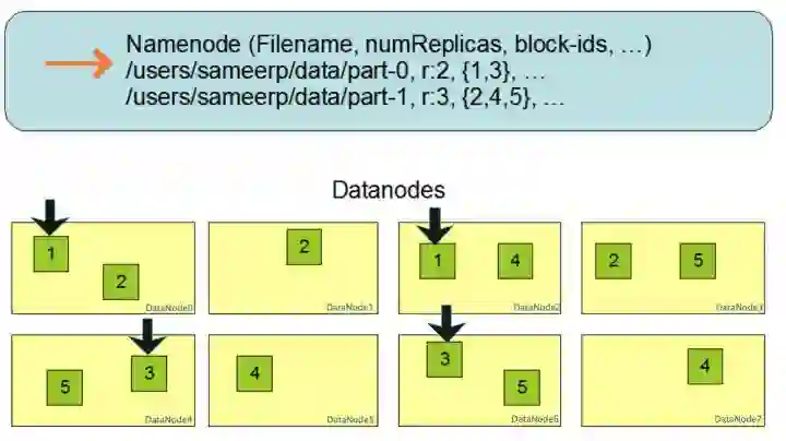 对于文件/users/sameerp/data/part-0,其复制备份数设置为2,存储的block ID为1,3,block1的两个备份存储在DataNode0和DataNode2两个服务器上,block3的两个备份存储DataNode4和DataNode6两个服务器上,上述任何一台服务器宕机后,每个block都至少还有一个备份存在,不会影响对文件/users/sameerp/data/part-0的访问。