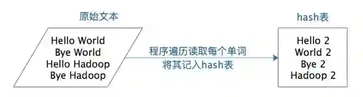 我们以WordCount程序为例。WordCount主要解决文本处理中的词频统计问题,就是统计文本中每一个单词出现的次数。如果只是统计一篇文章的词频,几十K到几M的数据,那么写一个程序,将数据读入内存,建一个Hash表记录每个词出现的次数就可以了,如下图:
