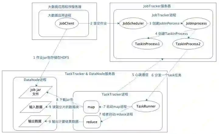 TaskTracker进程:负责启动和管理map进程以及reduce进程。因为需要每个数据块都有对应的map函数,TaskTracker进程通常和HDFS的DataNode进程启动在同一个服务器,也就是说,Hadoop集群中绝大多数服务器同时运行DataNode进程和TaskTacker进程。