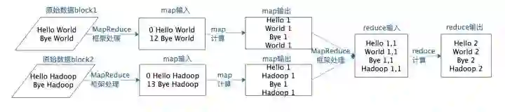 假设有两个block的文本数据需要进行词频统计,MapReduce计算过程如下图: