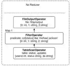 Hive内部预置了很多函数,Hive的执行计划就是根据SQL语句生成这些函数的DAG(有向无环图),然后封装进MapReduce的map和reduce函数中。这个例子中,map函数调用了三个Hive内置函数TableScanOpoerator、FilterOperator、FileOutputOperator,就完成了map计算,而且无需reduce函数。