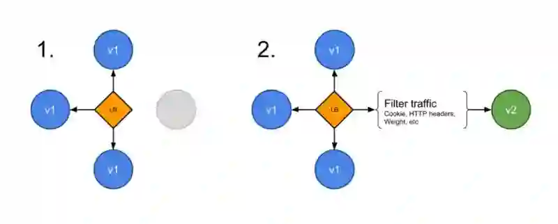 A/B 测试:部署新版本,流量控制倒流,长期在线。严格来说,这是一种线上业务与商业化验证的模式,不是变更策略。