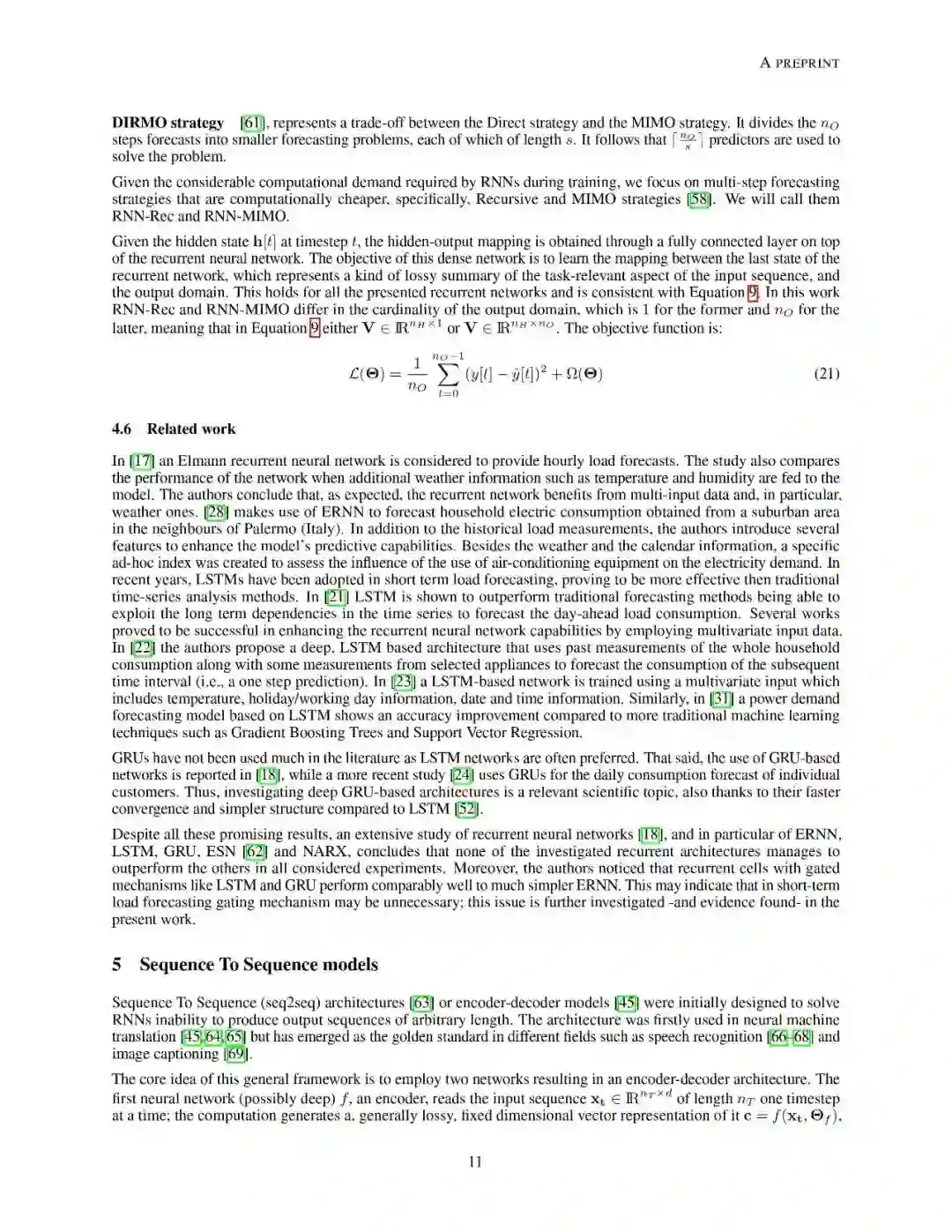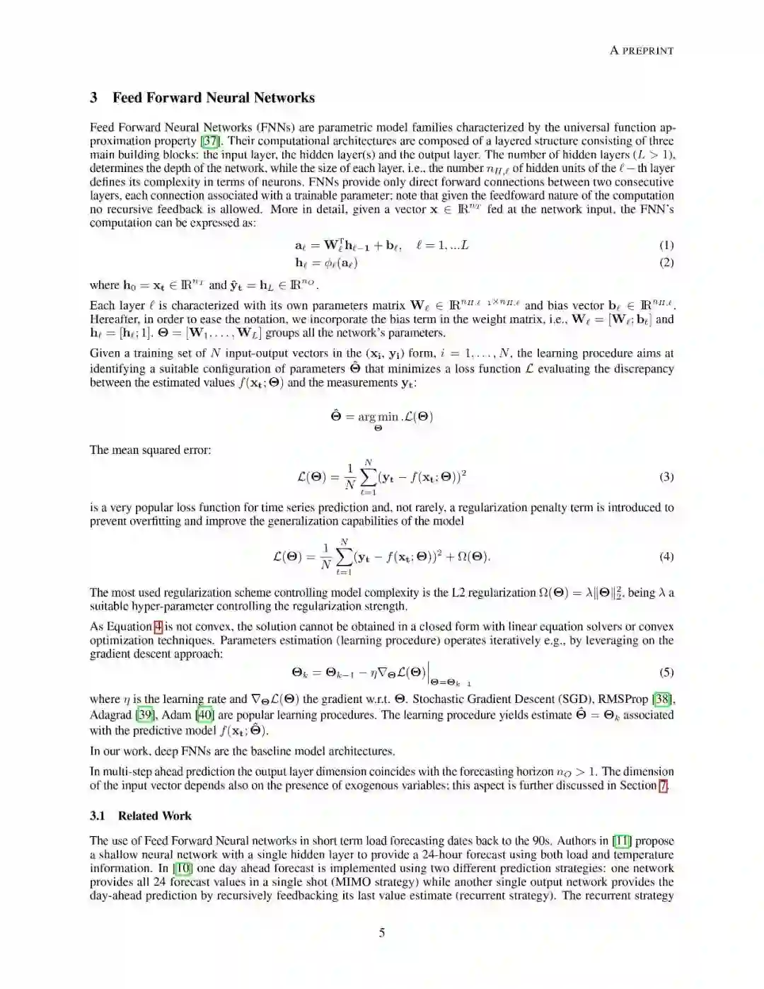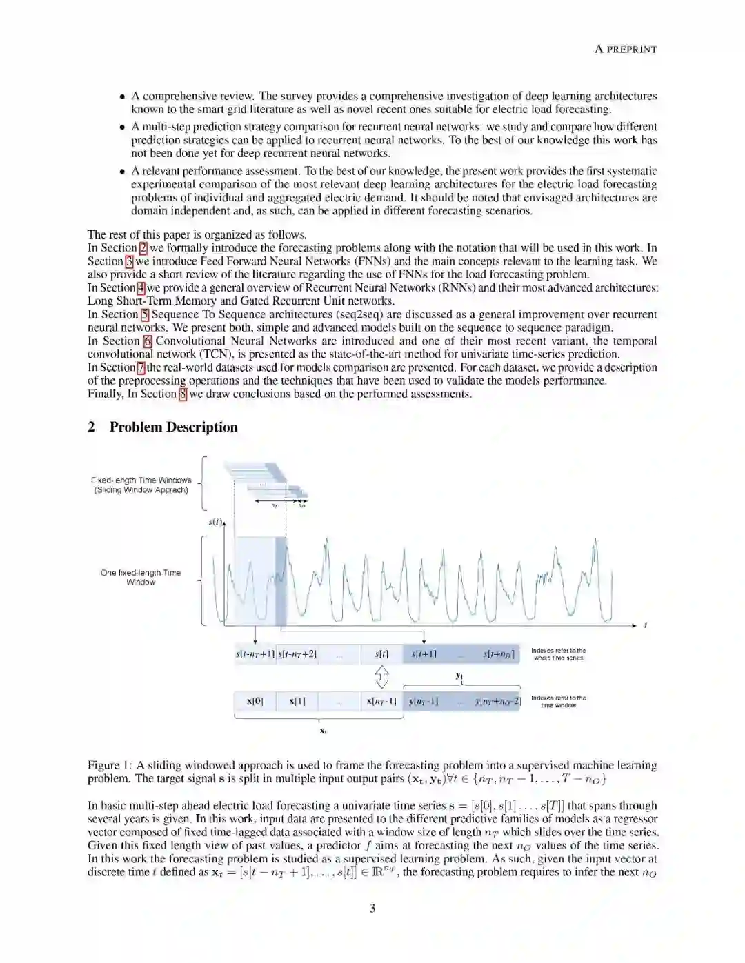 文章组织结构如下:第2章介绍了预测问题模型以及文中使用到的符号定义。之后章节分别介绍了前馈神经网络和与学习预测任务相关的概念定义;递归神经网络的总体概述和目前最先进的两种变体架构:长短时记忆网络和门控递归单元网络;接下来详述了序列到序列结构(seq2seq)对递归神经网络的提升;同时也分析了卷积神经网络和时域卷积网络。最后,作者介绍了来自真实场景的数据集,可以用于对各个方法模型进行性能对比。
