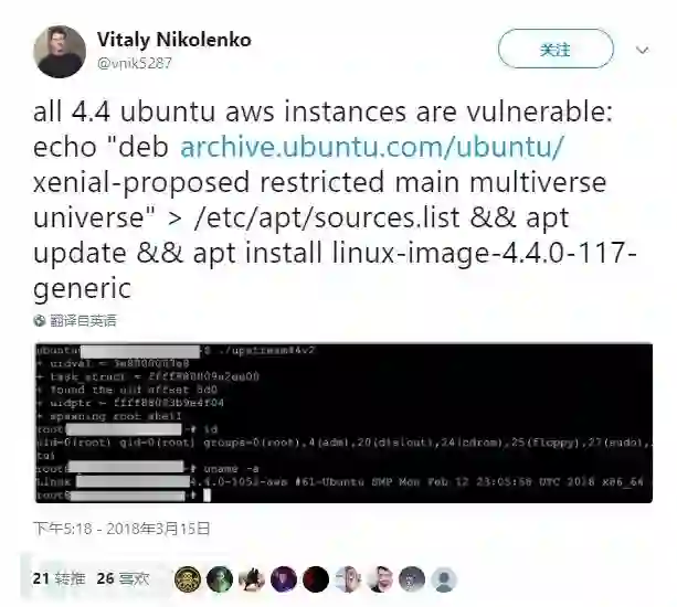今天下午,Twitter 用户 @Vitaly Nikolenko 发布消息,称 ubuntu 最新版本(Ubuntu 16.04)存在高危的本地提权漏洞,而且推文中还附上了 EXP 下载地址。