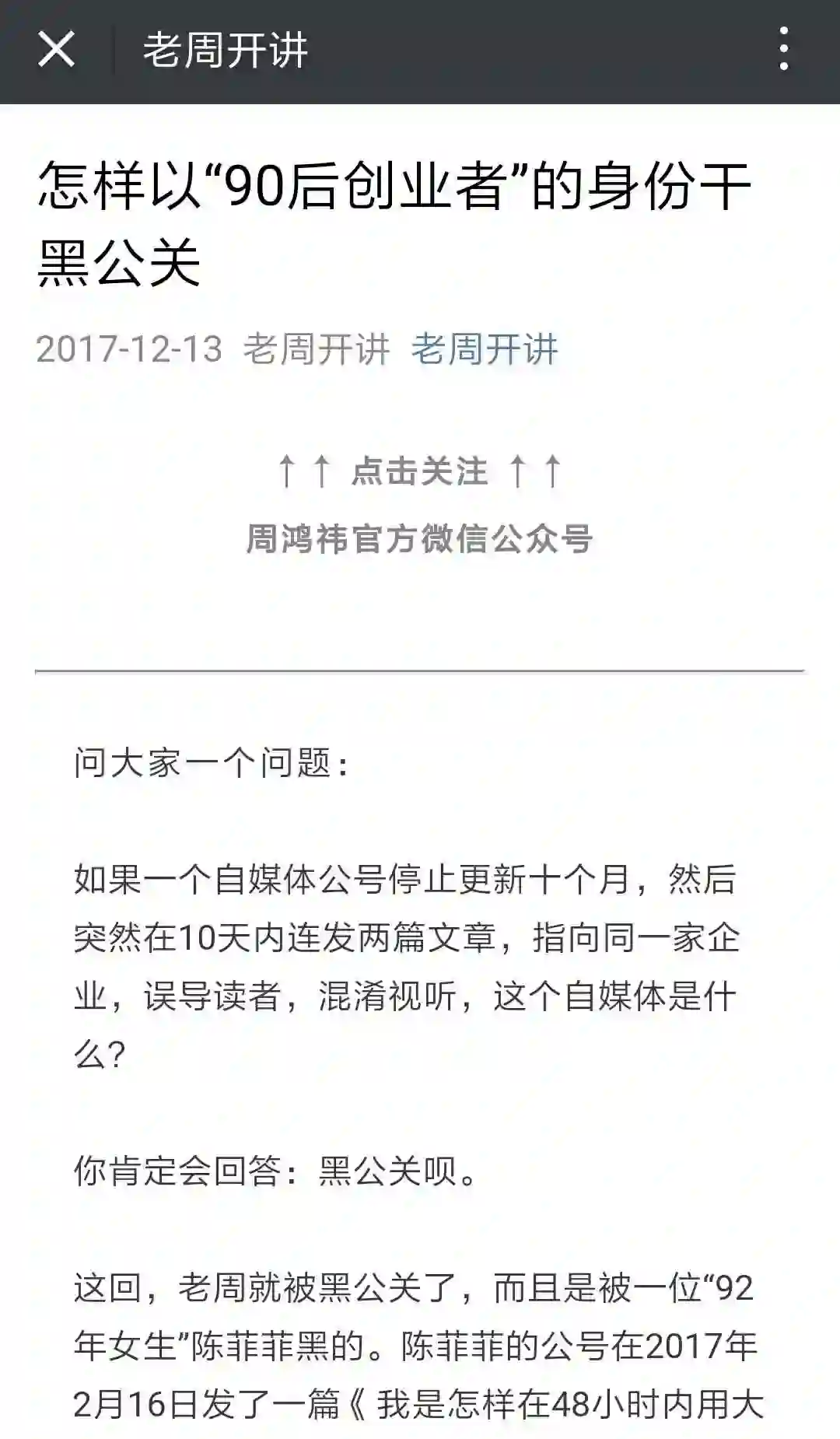 今日,周鸿祎在其个人公众号“老周开讲”发文,炮轰“92年女生”收钱抹黑360,并以她为例,分析了黑公关的四个明显特征:1. 标题党;2. 混淆视听,语焉不详;3. 大号推广;4. 莫名其妙集中开火。