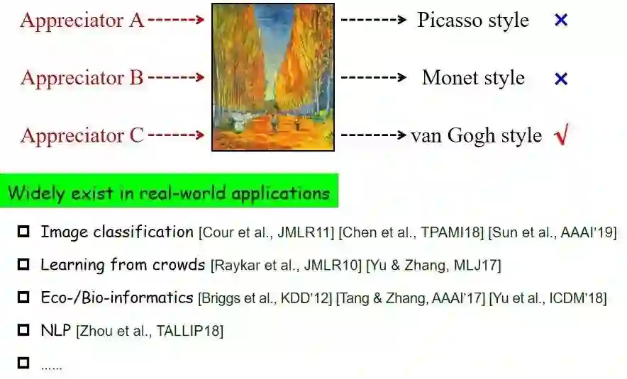 对于偏标记学习的框架设计,张教授用一个简单例子进行了解释:“假设现在有一幅油画,请大家判断一下是什么风格。不同人给出不同答案,这样便可以获得关于这个对象多个侯选标记,但显然在多个标记当中只有一个标记是正确的。”这只是一个非常简单的例子,实际上偏标记学习问题在很多真实学习建模任务当中都会遇到,包括图片分类、自然语言处理等任务。