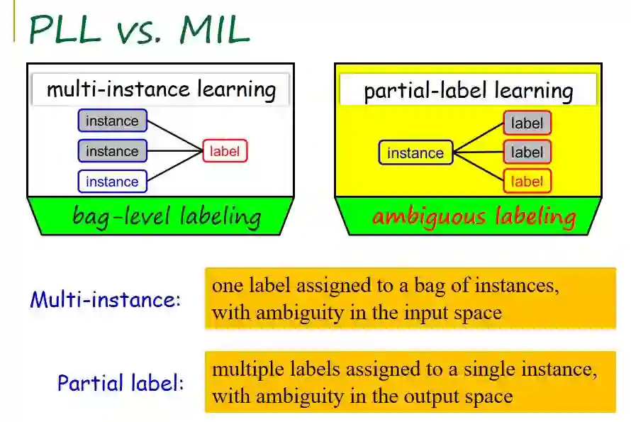 如果把偏标记学习与多事例学习做对比,相同之处在于,基于对象和事例的标记都是未知的。不同之处在于,对于多事例学习而言,它的歧异性出现在输入端,每一个对象由多个事例表示;而偏标记学习的歧异性出现在输出端,其有多个侯选标记,但并不知道哪一个为真实标记。