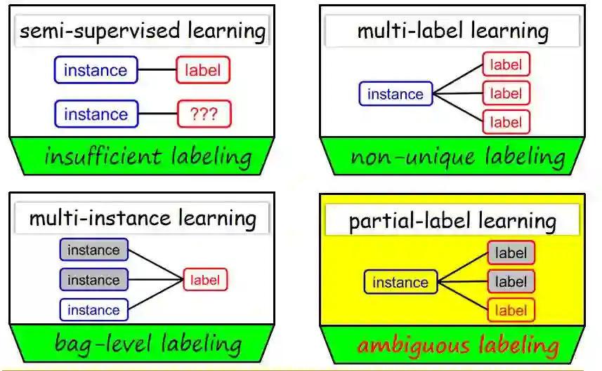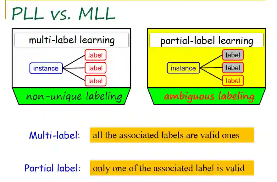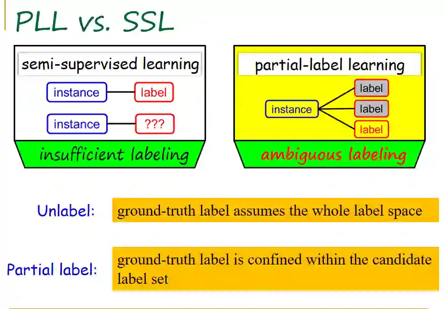 张教授将偏标记学习和半监督学习进行了比较。其相同之处在于,半监督学习中未标记对象的真实标记是不明确的;偏标记学习中训练样本的标记也是不明确的。不同之处在于,对于半监督学习,真实标记取值空间或者范围是整个标记空间,其中任何一个标记都可能是它的真实标记。对于偏标记学习,真实标记取值范围只能位于侯选标记集合中,其标记范围是限定的。