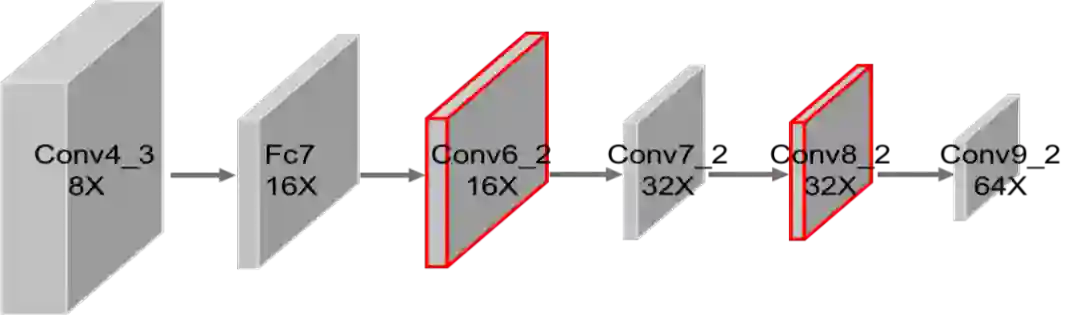 深度卷积神经网络通常是逐层下采样,这对于物体分类来说是有效的,但是对于检测任务来说是有损害的。基于时间和性能的权衡考量,我们对卷积网络中最后几层特征进行间隔采样,如图5,从Conv6_2层开始下采样,Conv7_2层保持原分辨率,Conv8_2层再下采样。