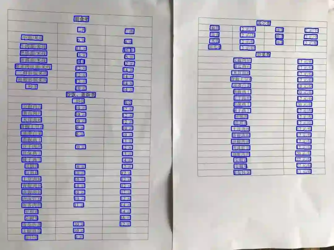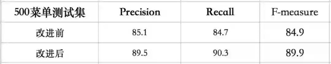 (3)此外,本方法也落地应用于实际业务场景菜单识别中。菜单上文字通常较小、较密,菜名文字可长可短,以及由于拍摄角度导致文字方向倾斜等。如图11所示,方法能很好的解决以上问题(小文字、密集文字行、长文本、不同方向);并且在500张真实商家菜单图片上进行评测,相比SegLink方法,性能明显提升(近5个点提升)。