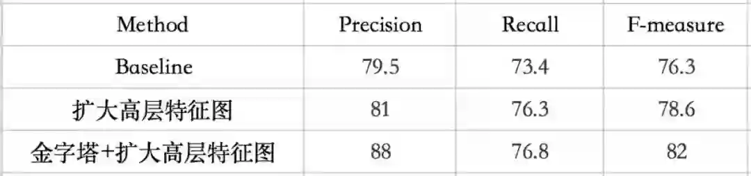 (1)我们首先对比了扩大高层特征图与不扩大高层特征图的性能比较,并在基础上对比加入特征金字塔后的性能比较,在ICDAR2015数据集上实验,结果如表1: