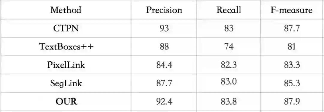 “BaseLine”方法是SSD框架+预测文字片段及片段之间连接关系模块,“扩大高层特征图”是在BaseLine方法基础上对高层特征图进行扩大,“金字塔+扩大高层特征图”是在BaseLine方法基础上对高层特征图进行扩大 并且加入特征金字塔。从表1中不难发现,扩大高层特征图可以带来精度和召回的提升,尤其是召回有近3个点的提升(73.4->76.3),这很好理解,因为更大的特征图产生更多的特征点以及预测结果;在此基础上再加入金字塔机制,精度获得显著提升,说明金字塔结构极大增强低层特征判别能力。