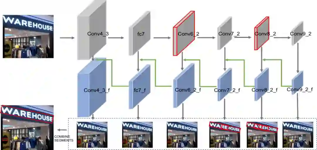 深度卷积神经网络是一个多层级网络结构,浅层特征图具有高分辨率及小感受野,深层特征图具有低分辨率及大感受野。具有小感受野的浅层特征点对于小目标比较敏感,适合于小目标检测,但是浅层特征具有较少的语义信息,与深层特征相比具有较弱的辨别力,导致小文本定位的性能较差。另一方面,场景文字总是具有夸张的长宽比(例如一个很长的英文单词或者一条中文长句)以及旋转角度(例如基于美学考虑),通用物体检测框架如Faster RCNN和SSD是无法回归较大长宽比的矩形和旋转矩形。