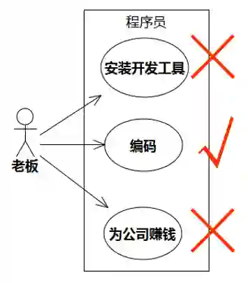例如,“程序员”这个人脑系统为它的老板提供的用例是什么?安装开发工具?编码?为公司赚钱?答案是编码,这是老板对程序员的期望以及程序员可以提供的承诺的平衡点,或者说,这是程序员能卖,老板愿意买的价值。程序员不能因为装了个Visual Studio就理直气壮向老板要报酬,老板不给就生气;程序员按要求编出了代码,老板就不能因为销售部门不给力或经济崩溃导致赚不到钱而责怪程序员。正确和错误的用例如图5-14所示。