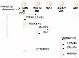 3. 根据以下业务序列图,请问属于“一卡通系统”执行者的是(可多选) A) 外来办事人员 B) 一卡通系统 C) 大院门口保安 D) 受访人\ E) 来车监控系统 F) 时间 |