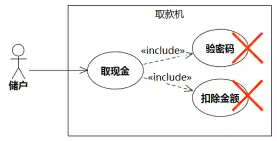 如果建模人员在粒度问题上热烈争吵,纠缠不清,有可能已经犯了错误。最常犯的错误是把步骤当作用例。如图5-16,右侧的“验密码”和“扣除金额”其实只是用例“取现金”的步骤(一眼可以看出其主语是系统),不是用例。Include(包含)关系也不是这样用的。Include的目的是为了复用在多个用例中重复出现的步骤集合,形状往往是多个用例Include一个用例。看到这种一个用例Include许多个用例的形状,基本上可以判断它犯了把步骤当作用例的错误。正确的做法是:把右侧的“验密码”和“扣除金额”作为步骤写在用例规约中。
