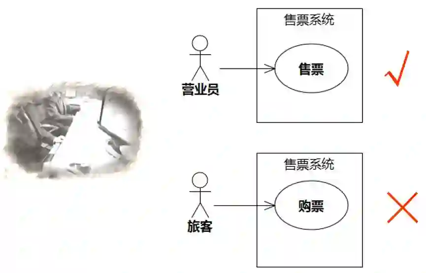 上面说的交互还引出一个问题:假设售票员使用鼠标和售票系统交互,按道理,比起售票员来,鼠标离售票系统更近,为什么不把鼠标作为售票系统的执行者呢?还有,假设售票系统运行在Windows操作系统之上,那么Windows是不是售票系统的执行者?