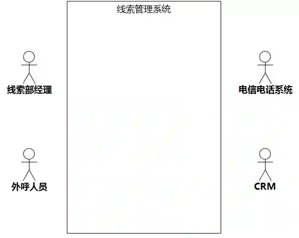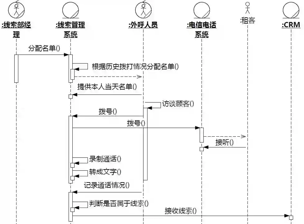 有了业务建模,就不需要头脑风暴了,直接从业务序列图映射即可。业务序列图上,和所研究系统有实线相连的对象映射为所研究系统的执行者。图5-11是某个房屋中介组织“寻找租客线索”的业务序列图,从中可以看出,和线索管理系统交互(有实线相连)的有线索部经理、外呼人员、电信电话系统和CRM,它们就是线索管理系统的执行者。映射到系统用例图如图5-12。
