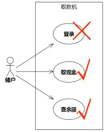 以取款机为例,“储户→登录”不是它的用例,因为储户对取款机的期望以及取款机能做的承诺不只是登录。或者这样思考:取款机不能这么叫卖:“来啊来啊!我这里能登录啊”,然后储户就说“哇,真棒,这正是我想要取款机提供的服务,好,我去用一用”。