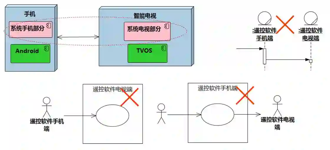 图5-6是一个通过物理位置来划分系统的错误例子。做一个通过手机遥控电视的控制软件,因为想到系统将来部署时可能会有一部分部署在手机端,另一部分部署在电视端。建模人员按照物理位置把系统分为手机端、电视端两个系统画在业务序列图上,映射到系统用例图时,得到两张系统用例图。