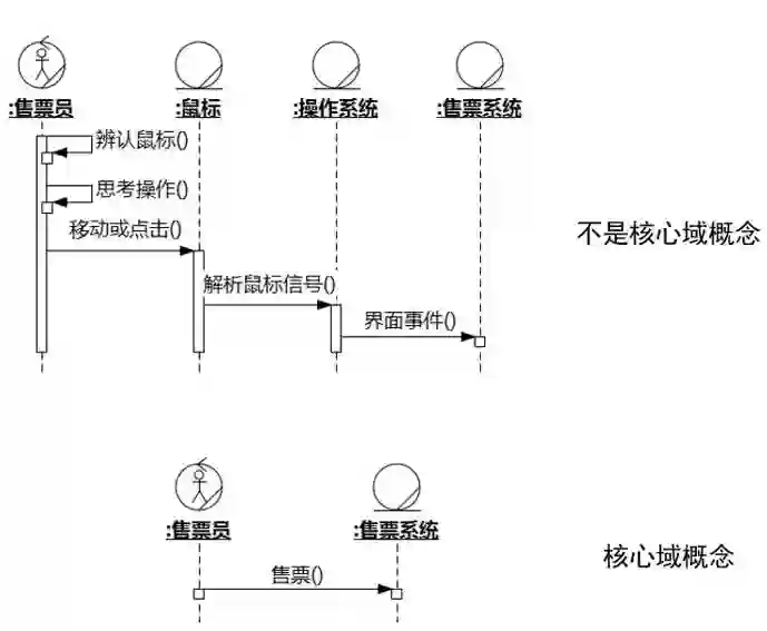 辨别的要点就是:执行者和系统发生的交互是系统的功能需求。如图5-9上部的序列图所示,售票员能自如地辨认并控制鼠标,是因为她的大脑里安装了如何使用鼠标的专家系统(可能是老师也可能是父母安装的)。猴子的大脑里没有这个系统,所以它很可能看到鼠标就一把抓起来往嘴里送。鼠标的移动和点击如何变成有效的输入事件,则由操作系统(包含了鼠标驱动程序)负责。以上这些交互都不是售票系统的核心域概念,售票员和售票系统之间的交互才是,所以售票员才是售票系统的执行者。