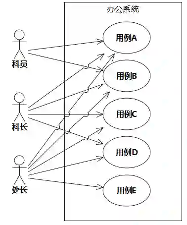 再看下面的例子。一个办公系统,科员有两个用例A和B。科长比科员级别高,所以除了自己的用例,还可以使用科员的用例。处长级别最高,想做什么就做什么,没人敢拦着。所以,建模人员画出了图5-15这样的蜘蛛网用例图,把执行者和用例的关系误解成了权限管理。