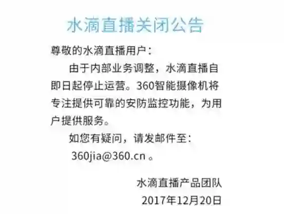 前一段,360水滴摄像头涉嫌泄漏隐私事件闹得沸沸扬扬,12月20日早间,360公司宣布:主动、永久关闭水滴直播平台。