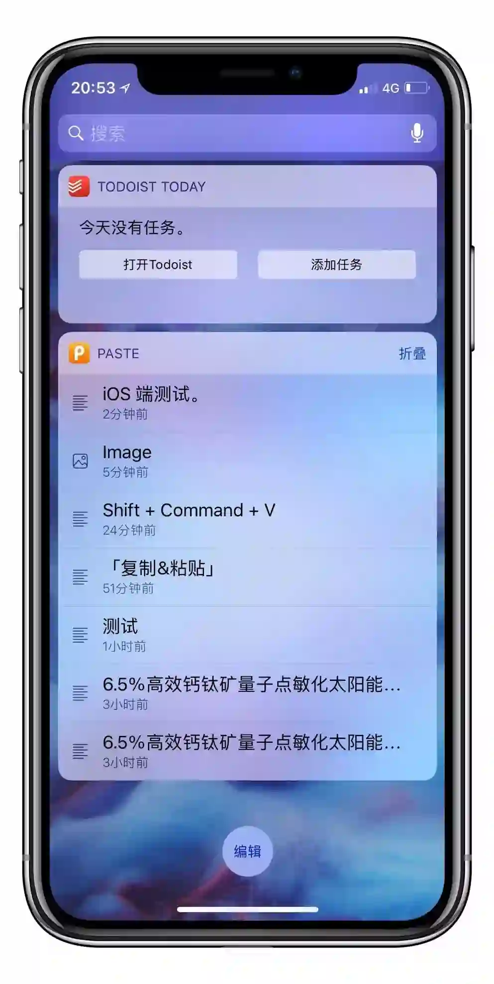 值得一提的是,Paste 2 在 iOS 端还加入了小组件。因为不像 macOS 上支持快捷键操作,所以开发者通过通知中心让用户快速的查看剪贴板列表和剪切版的变化。