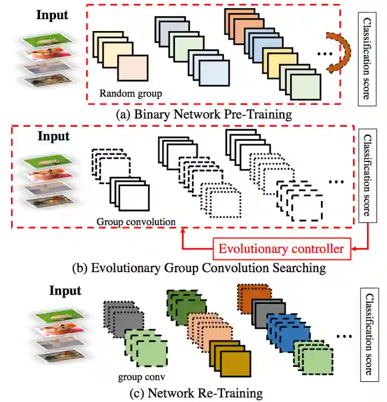 为了取得压缩率与网络精度之间的权衡,我们认为,每一层卷积对应的feature的抽象化程度不同,因此,对于表达能力的要求也不一样。基于这个假设,我们提出用网络自动搜索(NAS)的方法搜索每一层的组卷积的最优group数,作为depth-wise 卷积和全卷积之间的trade-off。