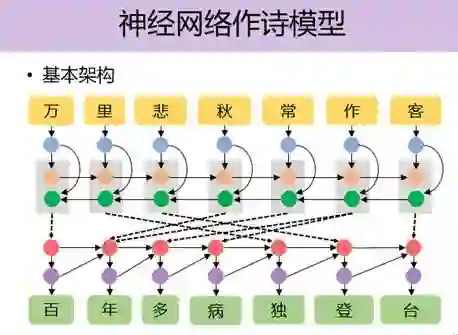 下面我们再看看创作古诗,为什么研究作古诗呢?这个很自然,我们想看看LSTM模型到底怎么样。于是就用古诗创作来检测这个模型,同时希望能对模型提出改进。大的框架和机器翻译是一样的,差别就是机器翻译实际上是考虑语义的相似性,古诗生成则是考虑语义的相关性,两者虽有差异,但模型其实差不多。