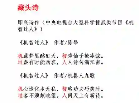还可以自动生成藏头诗。我们的古诗生成系统(起名叫“九歌”)现场创作,与人类诗人在效果上有一拼,各有特色,例如七绝首字藏“机智过人”。