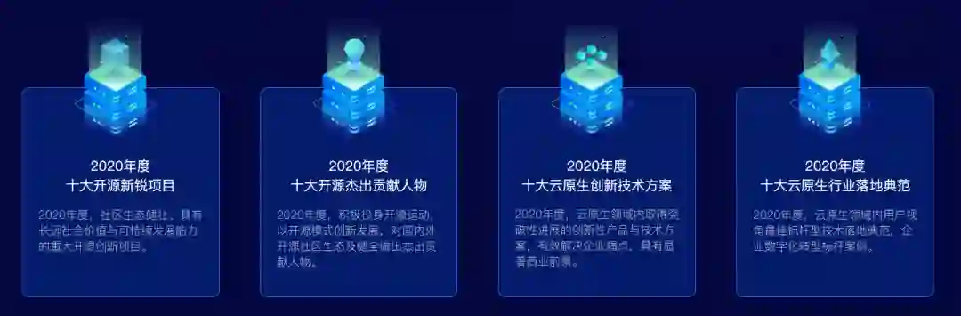 本次云原生、开源两大系列,四大榜单分别为:2020 年度十大开源新锐项目、2020 年度十大开源杰出贡献人物、2020 年度十大云原生创新技术方案以及 2020 年度十大云原生行业落地典范。