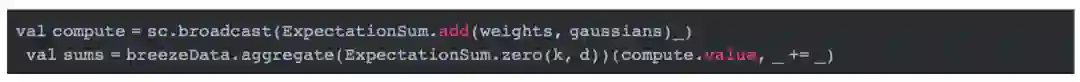 调用RDD的aggregate方法,我们可以基于所有给定数据计算上面的值。利用计算的这些新值,我们可以在M-步中更新mu和sigma。