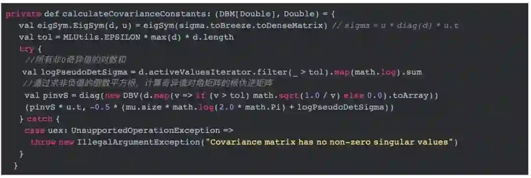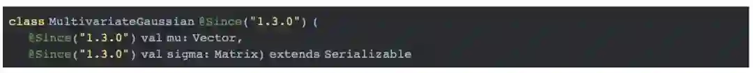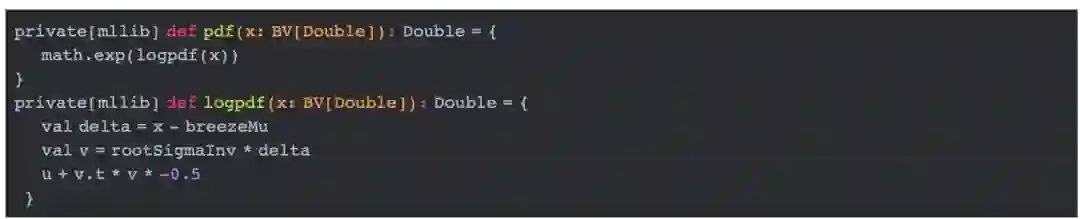 在上面的求参代码中,我们用到了MultivariateGaussian以及MultivariateGaussian中的部分方法,如pdf。MultivariateGaussian定义如下: