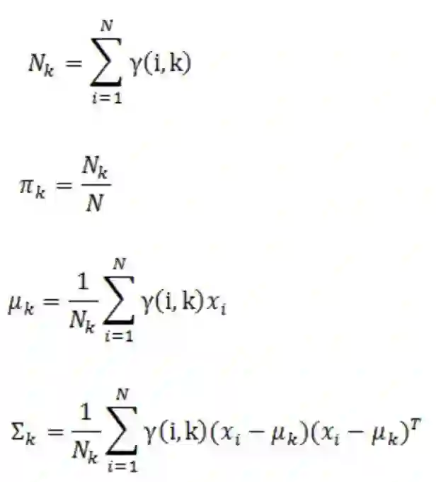 M-步。估计每个组件的参数。由于每个组件都是一个标准的高斯分布,可以很容易分布求出最大似然所对应的参数值,分别如下公式: