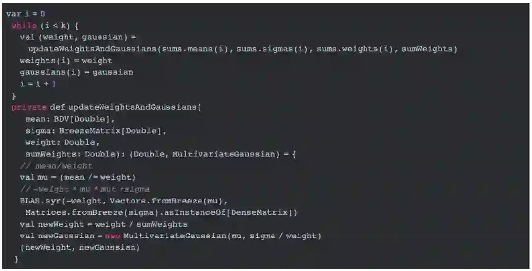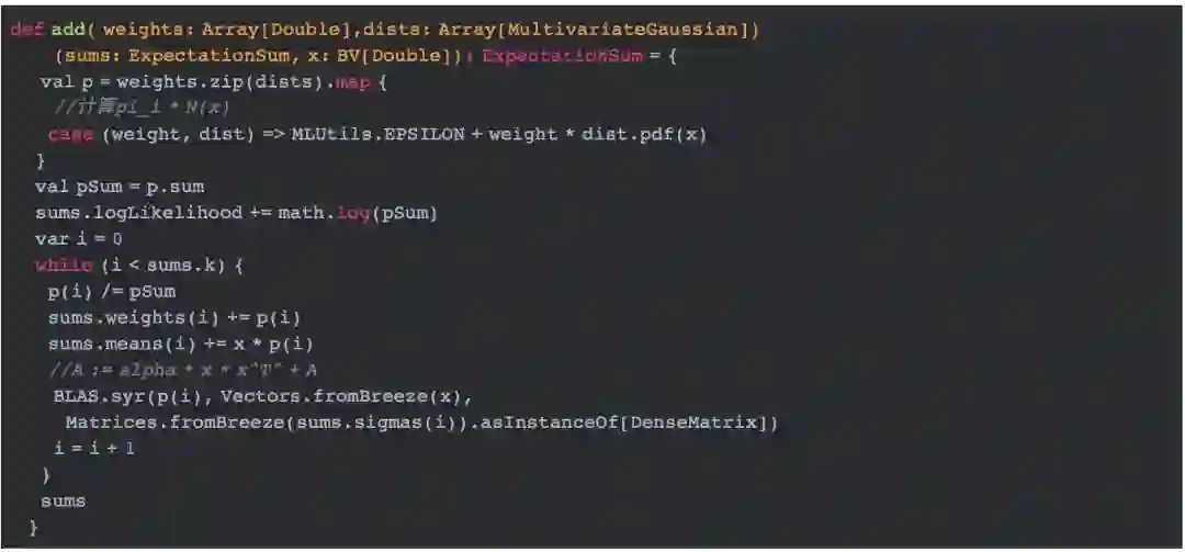 基于E-步计算出来的值,根据公式**(6),我们可以通过(mean /= weight)来更新mu;根据公式(7),我们可以通过BLAS.syr()来更新sigma;同时,根据公式(5), 我们可以通过weight / sumWeights来计算pi。