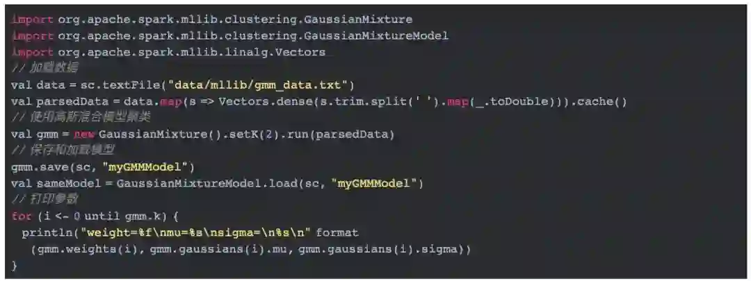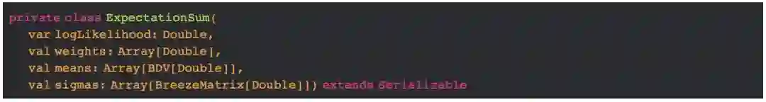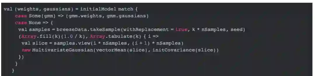 在上面的代码中,当initialModel为空时,用所有值均为1.0/k的数组初始化权重,用值为MultivariateGaussian对象的数组初始化所有的高斯分布(即上文中提到的组件)。 每一个MultivariateGaussian对象都由从数据集中抽样的子集计算而来。这里用样本数据的均值和方差初始化MultivariateGaussian的mu和sigma。
