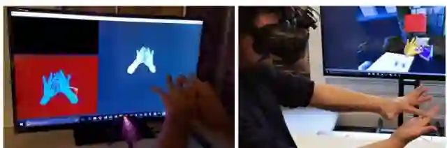 视频中他们还将Perceptive.IO的手部追踪系统和Leap Motion进行比较,可以看到动图中的骨骼式关节追踪方案在处理双手时出现了明显的问题,而Perceptive.IO则不会。