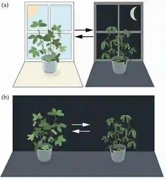 图1 含羞草内部生物钟实验(a)含羞草叶片会在白天朝向太阳展开,在傍晚闭合;(b)置于完全黑暗的环境下发现,含羞草仍然保持其正常的展开—闭合的昼夜节律