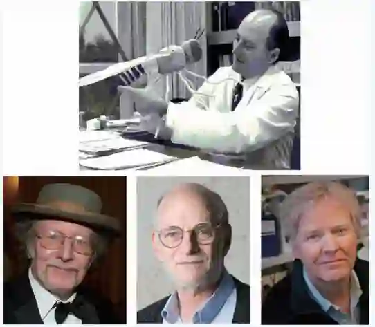 图2 生物钟基因研究的几位开创者。上图:本泽尔,下图自左向右依次为2017 年诺奖获得者霍尔、罗斯巴什、扬
