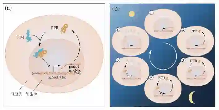 图3 (a)昼夜节律钟分子组成的简单图示;(b)以昼夜节律为例的节律基因反馈调节机制的简单图示