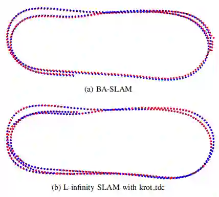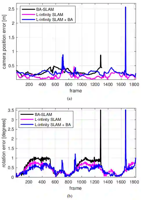 图1 (a)相机平移误差,(b)在Maptek数据集上测试的BA-SLAM和L-infinity SLAM的旋转误差。对比包括在相同的特征跟踪下krot_tdc fed的BA结果。