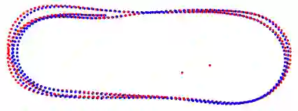 图2 估计相机的位姿(红点)上叠加了真值(蓝点)。分别对应(a)BA-SLAM和(b)L-infinity SLAM用提出来的krot_tdc解决闭环检测。