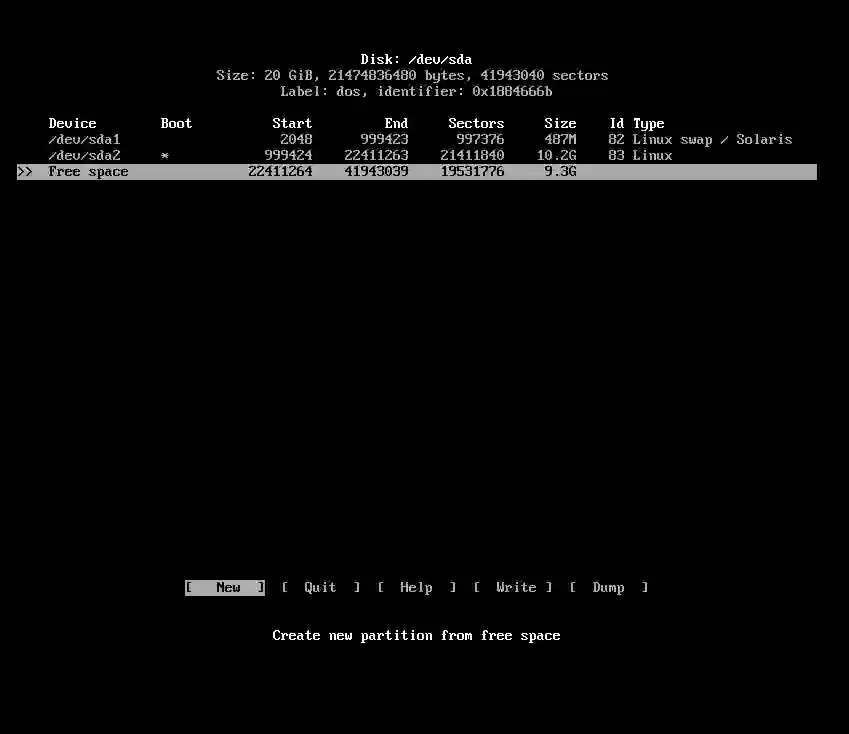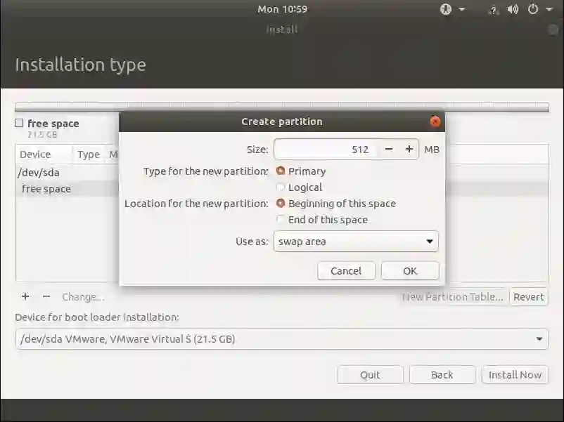 创建一个交换分区。最好是内存的一半大小。在我的例子中,我有 1 GB 的内存,因此创建一个 512 MB 的交换空间。