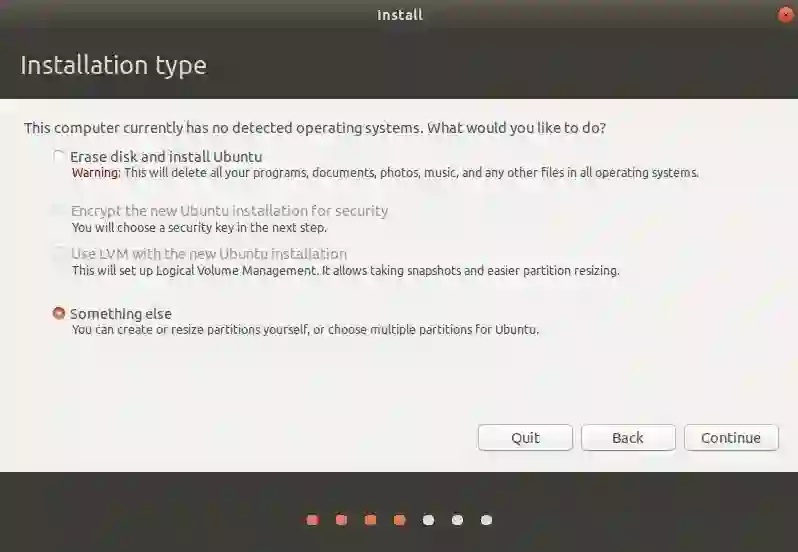 然后选择点击“Something else”,这样我们就可以对硬盘进行分区,并预留出 Ubuntu 和 Archlinux 的分区以及它们的交换分区的空间。
