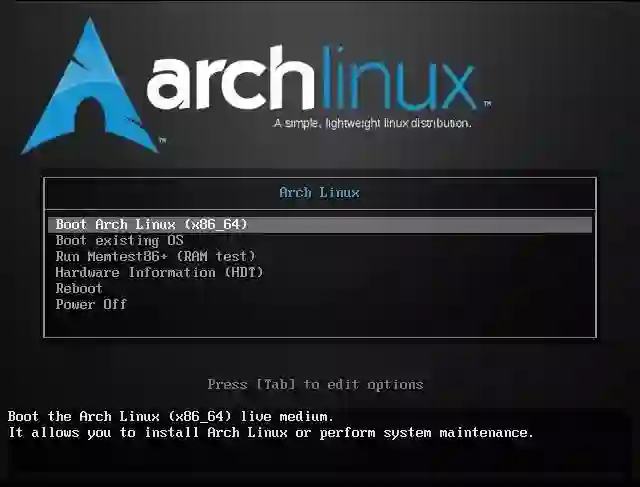 在确认成功安装后,重新启动并利用 Arch Linux 安装媒介引导。